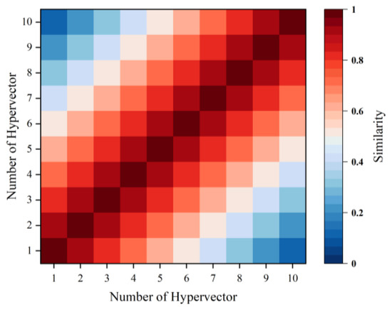For example, we encode ten levels of real-valued features in ascending order, where the minimum value corresponds to the hypervector of the first level, and the maximum value corresponds to the hypervector of the tenth level. Figure 4 illustrates the cosine similarity between hypervectors of different levels. It is evident that the greater the difference in real-valued features, the greater the cosine similarity between the encoded hypervectors.
