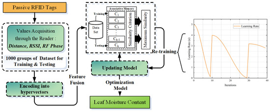 Figure 6 presents the comprehensive flowchart of our LMC detection system. This diagram outlines the sequential steps and processes involved; first, using the established RFID system, we collected multiple sets of RSSI, phase, and reading distance data from the leaves. These real-valued features were then encoded into hyperdimensional vectors. Using the algorithm framework, we developed (as shown in Figure 5) and built an initial leaf moisture content (LMC) prediction model. The model was further optimized through a retraining process. Finally, the LMC results were predicted. Figure 6 (right side) illustrates the tuning process of the key parameter, α, during retraining.