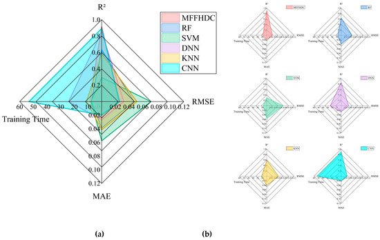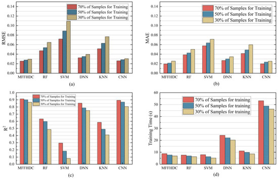 The parameters of our MFFHDC model were set to 10,000 dimensions. To enhance the credibility of our results, we conducted experiments with varying training-set ratios of 70%, 50%, and 30% within the dataset, and the results are displayed in Figure 9. In terms of experimental error, traditional simple machine learning algorithms such as Random Forest and SVM underperformed. With training-set ratios of 70%, 50%, and 30%, the RMSE values of our proposed MFFHDC method were 0.0255, 0.0276, and 0.0322, respectively, and the MAE values were 0.0195, 0.0224, and 0.0278, respectively. These accuracy metrics significantly surpassed those of Random Forest, SVM, and KNN. Moreover, the computational cost of HDC was much lower than that of CNN, making it a more efficient alternative.