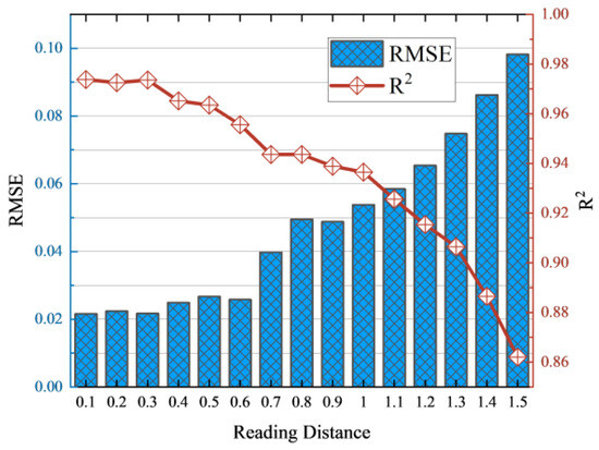 Considering practical applications, we assessed the performance of our model at different distances between the tags and the reader. As illustrated in Figure 13, when the distance between the reader and the tag was 1 m, the RMSE remained low at 0.0538, and the R2 was quite strong at 0.9365.