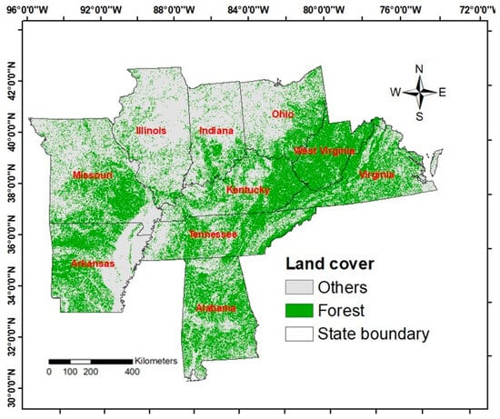 Study area mainly showing forest covers and others across ten states of the eastern US.