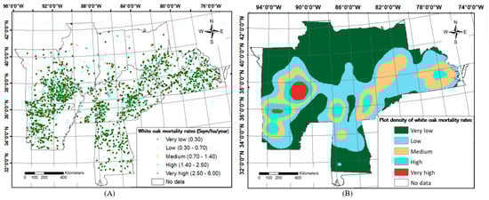 The spatial distribution of white oak mortality (WOM) rates across the eastern United States exhibited significant variation in both magnitude and density. Overall, WOM rates were widespread, yet displayed distinct regional differences in spatial patterns across the southern, central, and northern regions. In the southern region, mortality was predominantly characterized by very low to low WOM rates (e.g., parts of Alabama, Arkansas, and Tennessee), covering large areas across different latitudes and longitudes (Figure 2A). However, a few plots of high as well as very high mortality rates were also found in this region (e.g., parts of Arkansas and Tennessee). Despite the larger area of a low and very low plot density of WOM rates, some locations across the southern region depicted a high-plot density distribution of WOM rates (e.g., parts of Arkansas and Tennessee; Figure 2B).