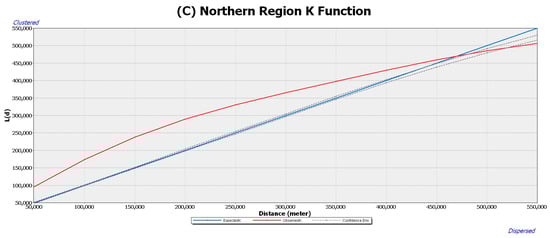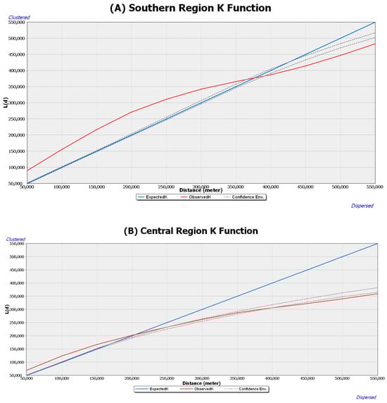 3.2. Spatial Distribution Patterns of WOM Rate at Southern, Central, and Northern Regions Using Ripley’s K Function
