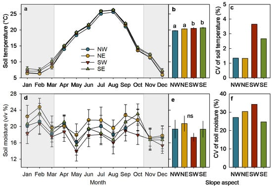 Differences in seasonal dynamic (a,d), growing-season mean values (b,e), and coefficients of variation (c,f) of soil temperature and soil moisture across different slope aspects. Data with the gray background represents the non-growing season. NW, northwest; NE, northeast; SW, southwest; SE, southeast. Bars labeled with different lowercase letters indicate significant differences at 0.05 levels (mean ± S.E., n = 6). ns, no significance.