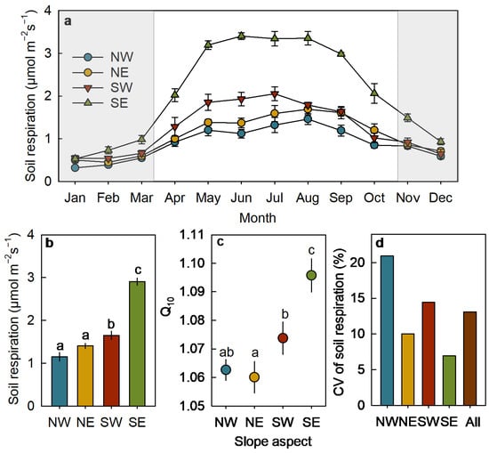 Differences in seasonal dynamic (a), growing–season mean values (b), temperature sensitivity (Q10, (c)), and coefficients of variation (CV, (d)) of soil respiration across different aspects. Data with the gray background represents the non-growing season. NW, northwest; NE, northeast; SW, southwest; SE, southeast. Bars labeled with different lowercase letters indicate significant differences at 0.05 levels (mean ± S.E., n = 6).