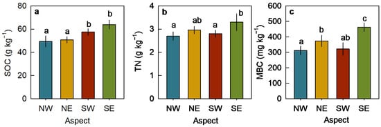 Differences in soil organic carbon (SOC, (a)), total nitrogen (TN, (b)), and microbial biomass carbon (MBC, (c)) across different slope aspects (mean ± S.E., n = 6). NW, northwest; NE, northeast; SW, southwest; SE, southeast. Bars labeled with different lowercase letters indicate significant differences at 0.05 levels.