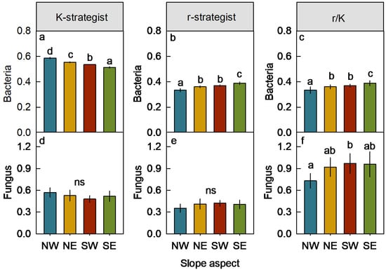Differences in K-strategist, r-strategist, and the ratio of r to K (r/K) of the soil bacteria (a–c) and fungus (d–f) community across different slope aspects (mean ± S.E., n = 6). NW, northwest; NE, northeast; SW, southwest; SE, southeast. Bars labeled with different lowercase letters indicate significant differences at 0.05 levels. ns, no significance.