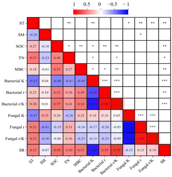 Relationships between soil respiration (SR) and soil physicochemical property and microbial community. ST, soil temperature; SM, moisture; SOC, soil organic carbon; TN, total nitrogen; MBC, microbial biomass carbon (n = 24). *, p < 0.05, **, p < 0.01; ***, p < 0.001.