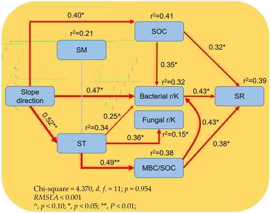 According to the Pearson correlation analysis, we found that soil respiration from different slope aspects displayed a positive correlation with soil MBC (r = 0.53), soil temperature (r = 0.53), SOC (r = 0.58), and TN (r = 0.50). In terms of soil bacterial community, we found soil respiration was positively dependent upon the soil bacterial r-strategist (r = 0.59) and the ratio of r/K (r = 0.79), whereas it was negatively related to the soil bacterial K-strategist (r = −0.86, Figure 5). According to the structural equation model (SEM), the slope aspect was positively related to soil temperature (r = 0.52), SOC (r = 0.40), and the ratio of bacterial r/K (r = 0.47) (p < 0.05, Figure 6). The soil organic C (R2 = 0.32, p < 0.05) and bacterial r/K (R2 = 0.43, p < 0.05) and the ratio of MBC/SOC (r = 0.38, p < 0.05) showed direct positive effects on soil respiration (Figure 6). The ratio of MBC/SOC also showed a direct effect on bacterial r/K (r = 0.43, p < 0.05). Changes in soil temperature caused by slope aspect showed positive correlations to the fungal r/K, whereas both of which showed no effects on soil respiration (Figure 6).
