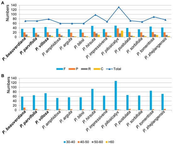 | P. villosa | 160,030 | 87,920 | 19,322 | 26,394 | 113 | 79 (7) | 30 (7) | 4 (4) | 36.5 |