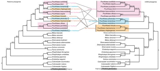 - Liu, G.N.; Ma, D.K.; Zhang, Y.; Hodel, R.G.; Xie, S.Y.; Wang, H.; Jin, Z.T.; Li, F.X.; Jin, S.H.; Zhao, L.; et al. Phylogenomic analyses support a new infrageneric classification of Pourthiaea (Maleae, Rosaceae) using multiple inference methods and extensive taxon sampling. Taxon 2023, 72, 1285–1302. [Google Scholar] [CrossRef]