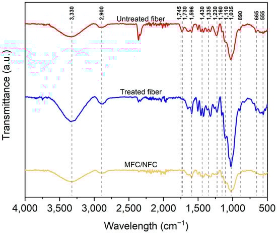 The differences between the FTIR spectra of treated and untreated coffee wood particles, as well as of the LCMF/LCNF produced, are noticeable, indicating changes in their chemical groups (Figure 1). The bands at 1745 and 1730 cm−1 represent the elongation of the C=O groups present in some lipids and the lignin molecule. The presence of some carboxylic acids and hemicelluloses is also related to these bands [60]. Furthermore, it was observed that the treated fibers presented higher intensity in the peak about the 1035 cm−1 band that corresponds to hemicelluloses (arabinoxylans and xylans) [61]. This reinforces what was previously explained about the effective action of treatment with 5% (w/w) NaOH for removing extractives. The band at 1035 cm−1 corresponds to the C-O-C (ether) bonds of the polysaccharides (hemicellulose and mainly cellulose). The increase in intensity can be correlated with the increase in cellulose content in the treated fibers (Table 1).