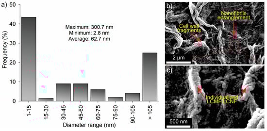 The most frequent diametric class was between 1 and 15 nm (43.5%), followed by the class > 105 nm (25%). The average diameter of LCMF/LCNF was 62.7 nm, with values ranging from 2.8 nm to 300.7 nm (Figure 3a). According to Ahmad Khorairi et al. [65], NFC has a nanoscale diameter in the range of 1–100 nm; that is, in this study, more than 65% of the LCMF/LCNF structures fall within this range. The morphology and diameter of these materials are strongly related to the cellulosic sources and the purification treatments applied [66,67]. Compared to other agro-industrial wastes, the LCMF/LCNF of coffee residual wood presented an average diameter close to that of corn straw nanofibrils (~64.5 nm) [68] and smaller than that of MFC/NFC of wheat straw (~92 nm) [64].