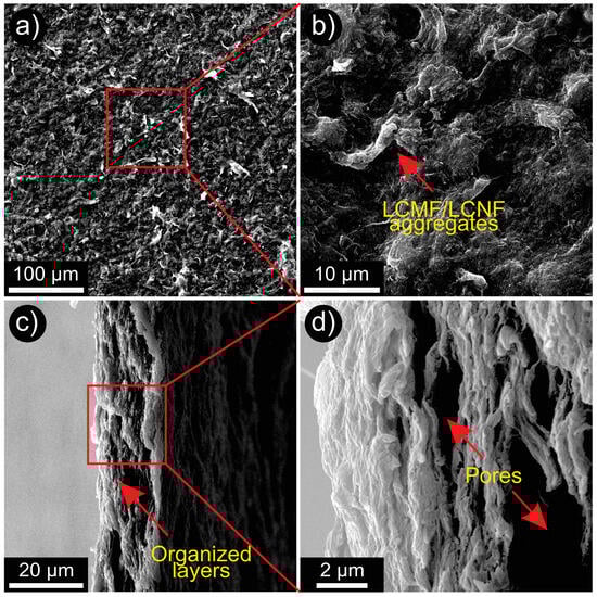 The microstructure of the fractured surface showed that the film consisted of randomly oriented LCMF/LCNF organized in layers (Figure 5c,d). Additionally, the SEM images revealed the existence of pores, possibly caused by LCMF/LCNF with larger dimensions and/or aggregates and bundles of fibrils. The greater degree of fibrillation provides a larger specific area and, therefore, a more significant number of hydroxyl sites available on the surface to form hydrogen bonds. Hence, more fibrillated LCMF/LCNF structures imply greater binding capacity and rearrangement of the filaments, forming more homogeneous and compact structures [79].