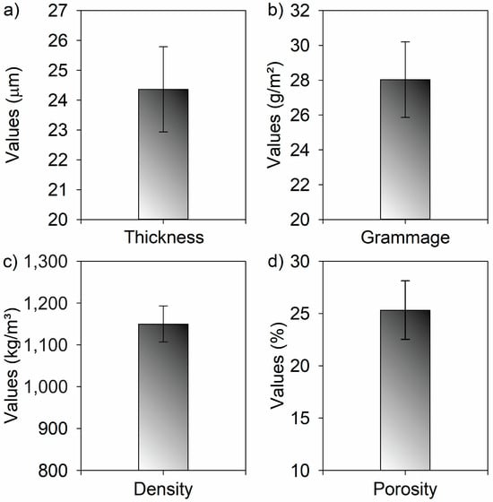 The average thickness and grammage were 24.4 ± 1.4 µm and 28 ± 2.2 g/m2, respectively (Figure 6). The thickness of the LCMF/LCNF film is influenced by its size. As previously discussed, structures with smaller dimensions will result in more compact and homogeneous arrangements, forming thinner and denser films.