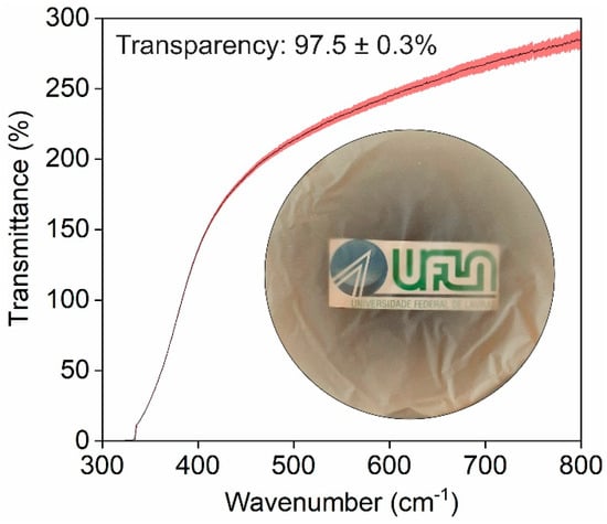 Considering the studies by Silva et al. [57], the density (~1160 kg/m3) and porosity (24.7%) of films produced with MFC/NFC from Eucalyptus sp., which showed excellent tensile strength and potential for use as packaging materials, were similar to the values found for the LCMF/LCNF film from coffee wood. It is important to highlight that the LCMF/LCNF film’s physical properties can be adjusted by adopting different treatments, fibrillation cycles, and production methods, which allow for obtaining desirable characteristics for certain applications. The number of fibrillation cycles and the treatments established during the pre-processing of the particles are reflected in the optical properties of the final product. The films generated with LCMF/LCNF from residual coffee wood obtained 97.5% transparency (Figure 7).