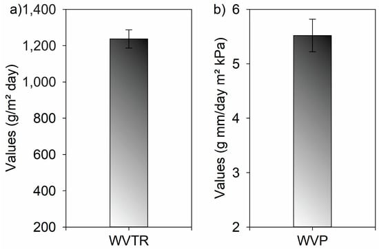 The WVTR values of the LCMF/LCNF films were ~1230 g/m2/day (Figure 8a). According to these results, the material can be indicated for packaging for bakery products, fruits, vegetables, and salads [81]. The results are consistent with films produced from MFC/NFC from other unconventional sources, such as açaí fibers (494 g/m2 day) and titica vine (637 g/m2 day) [57]. Furthermore, Mascarenhas et al. [3], considering NFCs from industrial pulps (Eucalyptus and Pinus), obtained films with WVTR values between 1200 and 1300 g/m2 day.