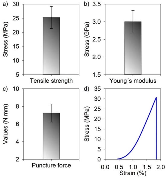 Tensile strength was evaluated according to ASTM D 882-18 [51] on a texturometer TATX2i produced by Stabel Micro Systems (Godalming, UK) equipped with a load cell with a capacity of 500 N. To determine strength, Young’s modulus, and elongation at break in the tensile test, 10 specimens of each treatment with 25 × 100 mm dimensions were used. Ten thickness measurements were obtained along the length of the specimens. The initial distance between the grips was 50 mm, and the test speed was 0.8 mm/s.
