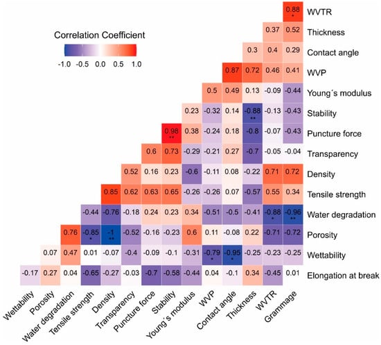 The WVP values observed for the LCMF/LCNF films were high (Figure 8b). The classification proposed by Wang et al. [81], the films have low water vapor barrier capacity (>3000 g µm/m2 day kPa), resembling films composed of silicone elastomers. The high WVP values can be attributed to the presence of voids on the surface of the films, as evidenced by SEM. Although non-significant, the correlation between porosity and WVP tends to be directly proportional (Figure 9), reinforcing this hypothesis.