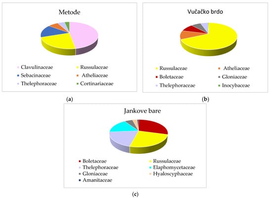 At the Vučačko brdo site almost 70% of all ECM roots were formed by members of the Russulaceae family. On the other hand, ECM taxa from the Clavulinaceae and Russulaceae families made up 70% of all ECM roots at the Metođe site, while at the Jankove bare site families Boletaceae, Russulaceae, and Thelephoraceae colonized over 70% of all roots and they were evenly represented. Similarly, in the spruce stand from Kopaonik, the dominance of the Thelephoraceae family in the spring and Russulaceae in the fall was previously observed by Katanić et al. [].