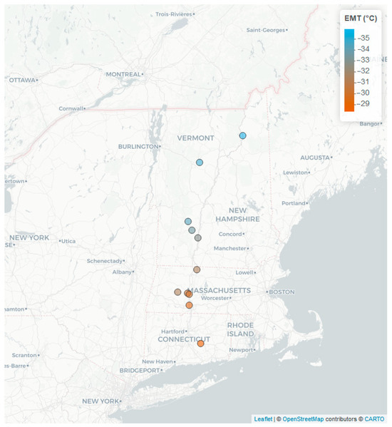 15], geographic coordinates and altitude can be entered to obtain an array of quantitative climate variables. The present study examined genotypes from a range of latitudes between 40.4° and 44.6° North, creating a climate gradient. Using geographic coordinates of survivor elm locations, we calculated 30-year mean annual temperature (MAT) ranging from 5.7° to 10.8 °C and extreme minimum temperature (EMT) ranging from −35.9° to −27.7 °C along this north-to-south gradient (