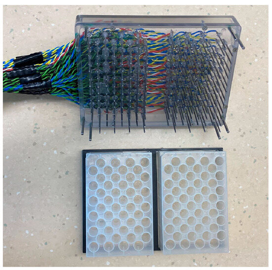 Figure 2), and was multiplexed to a datalogger to sequentially measure electrical conductivity with a half-bridge circuit. The plates were resealed with adhesive aluminum film and covered with a second layer of high-temperature aluminum HVAC tape. Using the environmental chamber in heating mode, the plates were exposed to 95 °C and held there for 2.5 h to cause extensive electrolyte leakage. The electrical conductivity of water is highly dependent on temperature and needs to be measured at a constant temperature, in this case, room temperature. With specific times dependent on the number of plates, the chamber was cooled to 3 °C for ~1 h and then run at 24 °C for an additional 1 to 2 h until the plates achieved a constant temperature. The plates were removed from the chamber, and placed in the shaker cabinet for 1 h, and final conductivity was measured with the multi-electrode system.