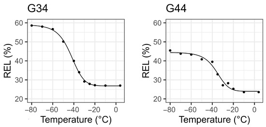 y-axis. For each individual tree, three replicates were sampled at each temperature, and electrolyte leakage was calculated using the mean values. This methodological replication is needed to constrain variation in tissue samples related to shoot diameter, pre-existing damage, the difference between branches, and leakage due to sectioning. The results were fitted to a logistic equation (Equation (1)) using the Dose–Response Curve package (DRC) [