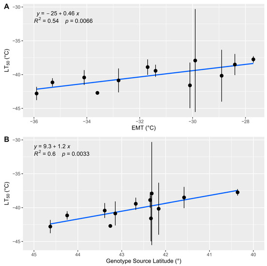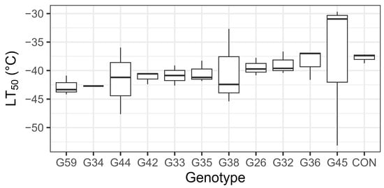 Even with protocol improvements, REL is a labor-intensive assay that requires one day of field collection to obtain fresh tissue, immediately followed by four days of laboratory procedures. Raw data from REL are inherently variable and improved by using multiple methodological replicates from an individual tree and taking the average value. We tried to account for sources of variation by modeling genotype effects and only collecting visually undamaged current-year shoots, but differences in tree health, shoot morphology, shoot diameter, age, neighbor effects, and preexisting damage did exist. The trees from Delaware, Ohio had some variation in age, being planted over four years (2018–2022) due to propagation bottlenecks, and the trees in South Burlington, Vermont were planted between 2005 and 2007. In the present study, we assayed 66 individual trees × 11 test temperatures × 3 methodological replicates, requiring the preparation of 2178 individual tissue samples. Larger sample sizes and, if necessary, assaying fewer genotypes to achieve better replication are advisable for more robust statistical inference. Some genotypes, particularly G38, G44, and G45, exhibited more variation than others (