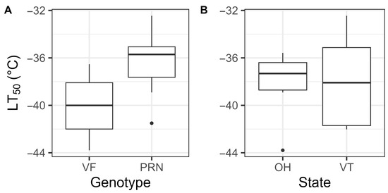 14]. Genotypes ‘Princeton’ and ‘Valley Forge’ were replicated in both Ohio and Vermont and provide an opportunity for comparing mid-winter cold hardiness between sites with different climatic conditions. The Ohio genotypes were propagated by the USFS NRS [