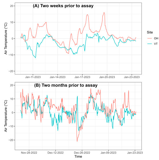 Weather data were accessed for West Campus, OH (21 km from Westerville, OH, USA) and South Burlington, VT via the Network for Environment and Weather Applications (NEWA) on 1 May 2024,