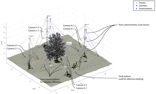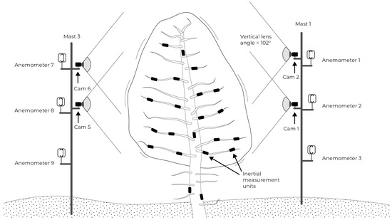 The cameras were mounted on four masts, which were equally distributed around the subject tree. Each mast held two cameras with a distance of approximately 3 m between each other, as well as three sonic anemometers, which are manufactured by the R. M. Young Company, Model 81000VRE (R. M. Young, Traverse City, MI, USA). The minimum number of masts was dictated by the anemometer measurements, as they require measurements to be made from all four sides at least. For financial reasons, we were not able to install more than four masts and eight cameras. Figure 1 shows the placement of the masts, cameras, and anemometers. The cameras were mounted such that they record in portrait mode, i.e., with the longer side of the sensor being vertical. This avoided capturing too much empty room around the tree and allows for a bigger vertical overlap. Figure 2 shows a side view of the mounting. The cameras were mounted on the masts, rather than being mounted on ground level, as we were more interested in the tree crown, rather than the lower parts of the tree. By doing this, we ensured that the cameras are as close to the subject area as they can be without sacrificing the overlap.
