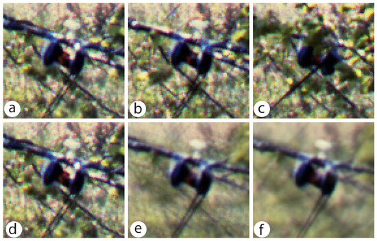 Visualization of a feature (Leica 360°-prism) over time (a–c) and the average feature frame over time (d–f). (a) Frame 0 of the feature. (b) Frame 15 of the feature. (c) Frame 151 of the feature. (d) Average frame 0 of the feature. Since this is the first frame of the feature, the algorithm has no way of differentiating the foreground from the background. The entire feature therefore appears sharp. (e) Average frame 15 of the feature. Over those 15 frames, the prism has already moved, and the background, therefore, has changed. Due to that, the background is starting to become blurry, while the prism is still relatively sharp. (f) Average frame 151 of the feature. The algorithm has now fully understood the difference between the foreground (the prism) and the background. The background, therefore, appears entirely blurred, while the prism is still sharp. Note that the algorithm also identified the branch and the inertial measurement unit (IMU) as stationary. This allows the algorithm to keep track of the feature, even if parts of it are obscured, e.g., due to moving leaves. Of particular note is (f), as this frame shows that the algorithm is still able to track the feature, even though it is partially covered by leaves.