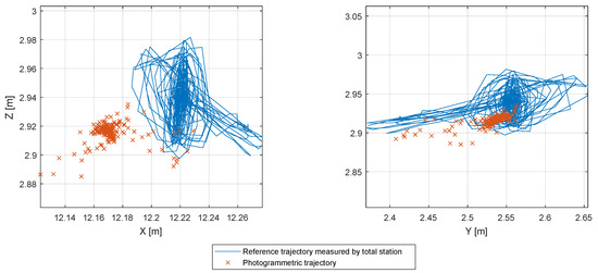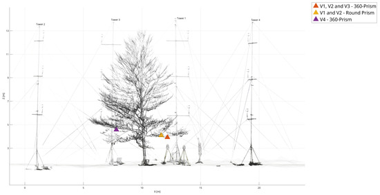 To validate the setup and processing workflow, we performed multiple comparison experiments in which we attached one or two reflective prisms to the tree. In particular, we attached them close to IMUs, such that the acquired data could also be used to validate the IMU data in the future. Each prism was tracked from a total station that is capable of automatic tracking. In our case, these were a Leica MS60 [69] and Leica TS50 (Leica Geosystems AG, Heerbrugg, Switzerland) [70].