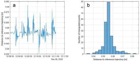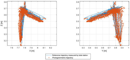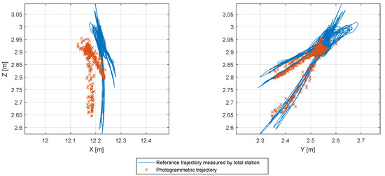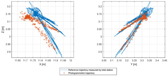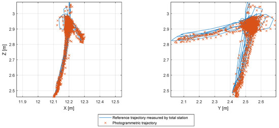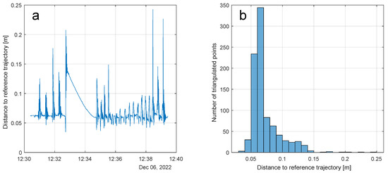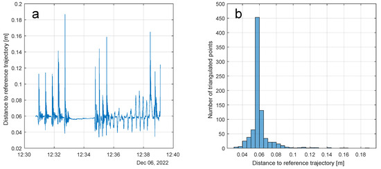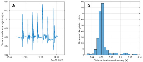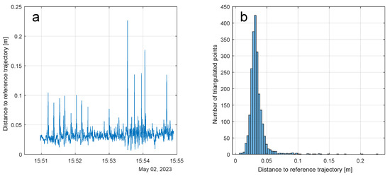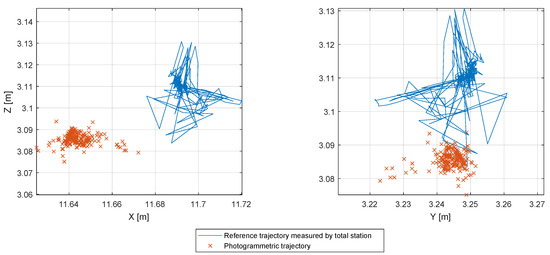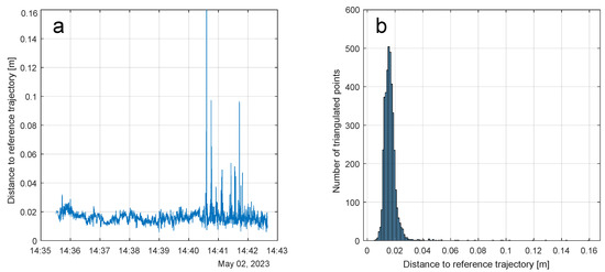 The detected chessboards were then imported into Agisoft Metashape (version 2.1.0.17532) to perform the extrinsic camera calibration. As mentioned before, the entire scene was also captured with an RTC 360 laser scanner, and an approximate location for each camera was extracted from the laser scan. We used a computer-aided design (CAD) model of the camera housing, lens, and camera body to deduce the projection center from these laser scans. Those estimated camera locations were entered into Agisoft Metashape as reference camera positions with an estimated accuracy of . To determine the aforementioned estimated accuracy of , we started with an estimated accuracy of , which is the nominal positional accuracy of the laser scanner [71]. To see how the results are impacted, we attempted to decrease the value to , which is the nominal range accuracy of the laserscanner [71]. We observed that the results did not change within our expected margin of error. We then used the “Align photos” workflow in Metashape to calculate the extrinsic camera parameters. While the exact algorithms used for Agisoft Metashape are not known publicly, we assume that it uses the collinearity equations in a bundle-block adjustment with the reference positions estimated from the laser scan as an initial guess.