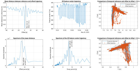 The employed template search algorithm is based on [75]. This algorithm assumes, however, that there exists only one tracking template. In our case, we had a video recording of the feature, and over time, as more frames were analyzed, more versions of the tracking template became available. Instead of just using one feature as the tracking template, the tracking algorithm, therefore, analyzes multiple feature templates around the current timestamp. The operator can specify the exact number of surrounding templates to be used. The algorithm performs a template search on the target frame for each possible feature template and then scores each tracking result according to Formula (1). Table 1 explains the variables used in Formula (1). After the scores are evaluated, the tracking result with the highest score is deemed the best and is, therefore, used as the overall tracking result. This approach offers the advantage that the algorithm can choose a different template if, e.g., the appearance of the feature changes periodically, e.g., because the prism is swaying in the wind.
