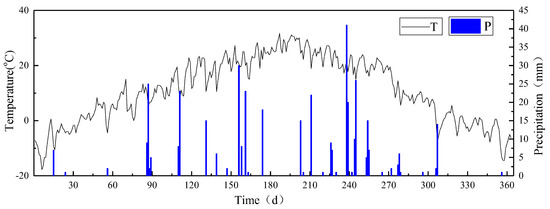The rainfall and temperature of the study area both increased initially and then decreased. The rainy season was July and August, and the other months with less rainfall represented the dry season. The precipitation during the entire growing season was 460.5 mm. The maximum rainfall at the end of August was 40 mm/day, while the dry season had no rainfall for the last two months. The high-temperature season of the study area and the rainy season occurred simultaneously, with higher temperatures recorded from June to August and lower temperatures from November to March. The average temperature was 12 °C, which was no significant difference from the average temperature over the years. The highest temperature in June was 11 °C and the lowest temperature in January was −18 °C (Figure 1).