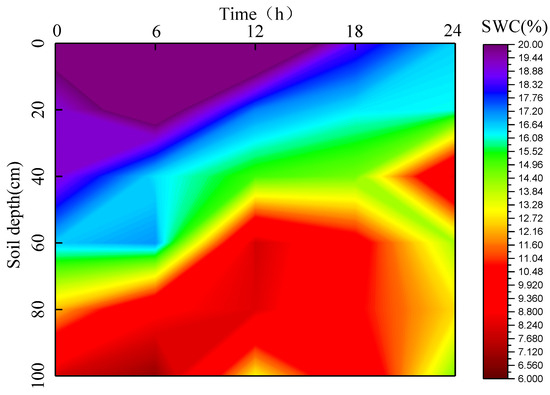 The surface SWC showed a decreasing trend over time, and the SWC at 20–80 cm first increased and then decreased, while the SWC at 100 cm showed an increasing trend (Figure 2). At 0, 6, 12, 18, and 24 h after the rainfall, the SWC at 0–20 cm was 22.48%, 22.00%, 20.64%, 18.49%, and 16.56%, respectively. The highest SWC was 1.35 times higher than the lowest SWC. At 20 cm, the SWC reached a maximum of 21.03% at 6 h after the rainfall and a minimum of 16.19% at 24 h after the rainfall. The SWC at 6 h was 1.29 times than that at 24 h. The SWC at 40 cm was 8.35%, 10.43%, 14.61%, 19.13%, and 15.12% at 0, 6, 12, 18 and 24 h after the rainfall, indicating a trend of initial increase and then a decrease. The SWC at 100 cm was 8.07%, 6.88%, 9.15%, 12.98% and 14.54% at 0, 6, 12, 18 and 24 h after the rainfall, respectively.