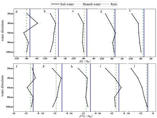 The hydrogen (δ2H) and oxygen (δ18O) values of soil and branch water in the forest at different times after rainfall ((a,f): after 0 h of rainfall; (b,g): after 6 h of rainfall; (c,h): after 12 h of rainfall; (d,i): after 18 h of rainfall; (e,j): after 24 h of rainfall).