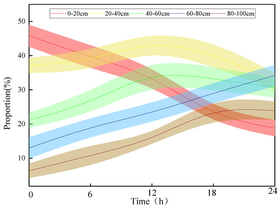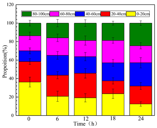 At 0–6 h after the rain, the rainfall had mainly permeated the middle and shallow soil layers (0–60 cm) but had distributed evenly in each soil layer at 18 h after the rainfall (Figure 4). At 0 h after the rainfall, the rainfall in the 0–20, 20–40 and 40–60 cm soil layers accounted for 45.79%, 37.14% and 21.14% of the total SWC, respectively. However, the rainfall retained in the 80–100 cm soil layer only accounted for 6.31%. At 6 h after the rainfall, the water storage ratio of the 0–20 cm soil layer decreased, and the water storage ratio of the other soil layers increased. The water storage ratio of the 60–80 cm and 80–100 cm soil layers increased to 19.20% and 10.81%, respectively. At 12 h after the rainfall, the proportion of rainfall in different soil layers followed the same trend as at 6 h and was 34.31%, 44.63%, 35.62%, 23.27% and 15.25% at 0–20, 20–40, 40–60, 60–80 and 80–100 cm, respectively. Moreover, the distribution of the rainfall in the different soil layers was relatively uniform at 24 h after the rainfall, with 18.82%, 32.54%, 30.62%, 34.20%, and 23.91% distribution proportions at 0–20, 20–40, 40–60, 60–80 and 80–100 cm, respectively. The 0–20 cm soil layer stored the least amount of water, while the 60–80 cm soil layer stored the highest amount of water.