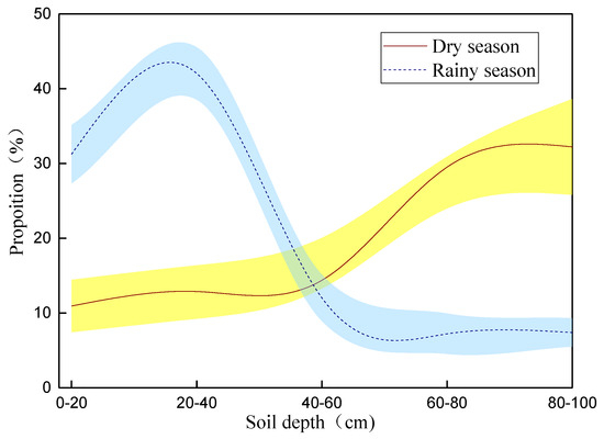 The SWC of the locust forest during the rainy season was 15.6% and 10.3% during the dry season (Figure 6). R. pseudoacacia mainly absorbed water from the surface soil layers during the rainy season and transferred its water sources to deep soil water in the dry season. During the rainy season, R. pseudoacacia mainly utilized shallow soil water, and the proportion of water used from the 0–20, 20–40, 40–60, 60–80 and 80–100 cm soil layers was 31.23%, 42.03%, 12.03%, 7.22% and 7.39%, respectively. However, during the dry season, the proportion of water used from the 0–20, 20–40, 40–60, 60–80 and 80–100 cm soil layers was 10.93%, 12.87%, 14.38%, 29.51% and 32.21%, respectively.