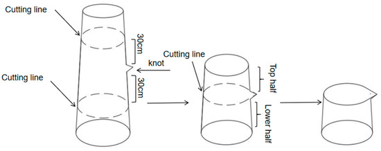 The six test logs with natural knots used in this study were sourced from Fujian Xinxin Jinshun wood processing mill. The logs included five pine (Pinus) logs and one fir (Cunninghamia lanceolata (Lamb.) Hook.). Each log measured 200 cm in length with a diameter at breast height (DBH) of approximately 25 cm. To facilitate test measurements, prominent and large natural knots were selected from the surface of the logs. The selected knots were positioned so that the distance between the top and bottom of each knot was 30 cm. The logs were then cut into segments, each 60 cm in length, with the selected knots centered within these segments. Each 60 cm segment was further sawn into two log discs, each 30 cm in height, with the knots centered on the cutting plane. The lower half of the log disc, measuring 30 cm in height, was uniformly chosen as the test specimen for measurement. Each of these test specimens was labeled and numbered accordingly. A schematic diagram of the processing and preparation of the test measurement log specimens is provided in Figure 1.