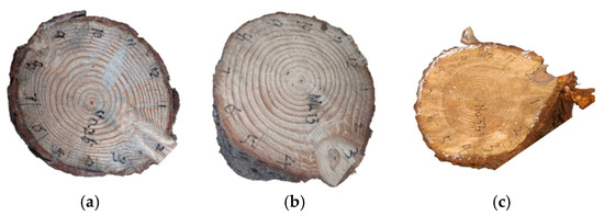 Cross-section of a double-knotted specimen log: (a) log No.4, (b) log No.5, (c) log No.6.