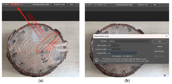The cross-sectional area of the specimen logs and the area of the knots, as listed in Table 1, were estimated using image processing software. The process began by measuring the actual radius R of the cross-sections of the six specimen logs with a straightedge. Next, photographs of the cross-sections were taken. These images were then imported into the image processing software. In the software, the radii of the cross-sections were marked using the ruler tool, which provided the pixel length of each specimen log’s radius (as shown in Figure 4a). The measurement scale was then set by inputting the actual radius length R, obtained from the physical measurements (as shown in Figure 4b). Finally, the software was used to select the cross-sectional area and the knot area of each specimen log, allowing for an estimation of these areas based on the established measurement scale.