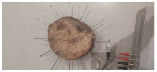 When measuring wood resistance, given the high resistance values of wood, the electrical impedance of the test object is modeled as a parallel combination of large resistance and small capacitance. The digital bridge is first turned on and allowed to warm up for 15 min. It is then zeroed for both open-circuit and short-circuit conditions. The digital bridge parameters are adjusted to the test resistance value, with the AC signal frequency set to 10 kHz, the signal level set to 1 V, the internal resistance set to 100 Ω, and the range set to automatic. Twelve resistance measurement points are uniformly selected around the circumference of the sample log. These points are marked on the cross-section of the log with a marker pen. Stainless steel nails are then arranged at these 12 measurement points and evenly spaced around the log disc, as shown in Figure 5. The nails are uniformly nailed into the log disc at the 12 designated measurement points.