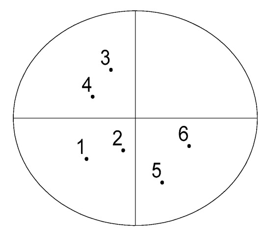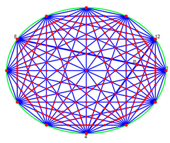 To perform spatial interpolation, the first step is to determine the attribute values of known nodes. For this, a right-angled coordinate system is established based on the cross-section of the sample log, and 12 measurement points are recorded. The resistance values along line segments connecting the two ends of the sample log are denoted as Rm∗n. The intersections of these line segments can be identified as multiple intersection points. As shown in Figure 6, point p is the intersection of line segments 1–8 and 4–12. Point p can have two different values, depending on three possible scenarios: (1) Both line segments 1–8 and 4–12 pass through the knot region, so their intersection point p also lies within the knot region. (2) If only one of the two line segments passes through the knot region, their intersection point p will not be within the knot region. (3) If neither line segment passes through the knot region, their intersection point p will not pass through the knot region either. Thus, only when both resistive segments pass through the knot region is the intersection point p likely to be in the knot region. Since the resistance in the knot region is higher than in the healthy part of the wood, the value of the segment with lower resistance is assigned to point p. Therefore, when there are multiple choices for the resistance value at an intersection point, covering the higher resistance value with the lower one better reflects the actual situation—this is referred to as the “node coverage method”.