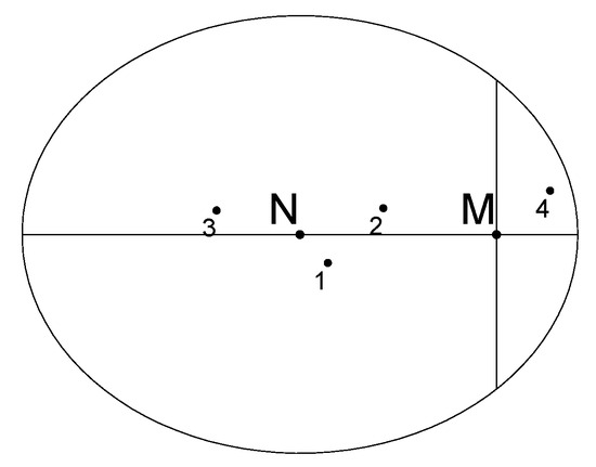 where and are the coordinates of the estimated point, and R is the average radius of the cross-section of log. If the value of is 1, it means that the estimated point is located in the outer region, and a radial search method based on eccentric circles needs to be used to screen the known points. As shown in Figure 8, point is the estimated point, point is the geometric center of the eccentric circle centered at point , and the center of the cross-section of the log is point , which is on the line . Therefore, a search radius r must be selected, with point N as the center, to define an area for filtering known points. As shown in Figure 8, four known points are located within this defined area. The eccentric circle is then divided into multiple quadrants with point M as the center. These four known points are filtered based on their distances relative to point M, and the attribute value of the estimated point is calculated. The farther point M is from the center of the sample log’s cross-section, the greater the deviation of the eccentric circle’s center, and the longer the distance from point M to point N. Since this eccentricity is related to the distance from point M to the center of the log’s cross-section, the eccentricity can be expressed as follows: