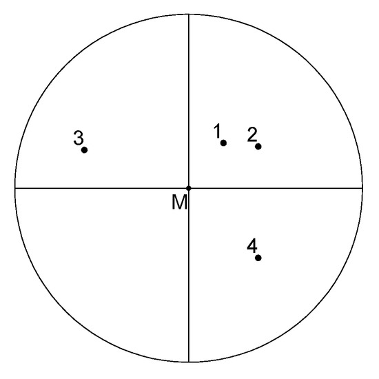 If the value of f(x,y) in Equation (2) is zero, it indicates that the estimated point is located in the central area, and the standard azimuth search method is used to filter known points. As shown in Figure 9, point M represents the estimated point. With point M as the center, a circle is drawn using a selected search radius to define the area for filtering known points. The search area is divided into multiple quadrants, with point M as the center. In each quadrant, only the known points closest to the estimated point M are selected to calculate its attribute value. If no known sample point meets the conditions in a given quadrant, only the known sample points from other quadrants are used as reference points to compute the attribute value of the estimated point. The attribute value of the estimated point M is then calculated using Equation (7).