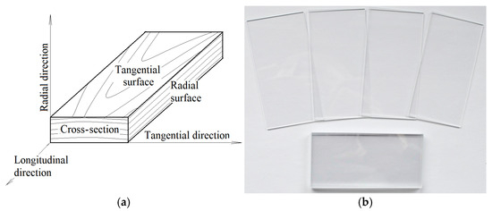 Specimen shape and dimensions. (a) spruce wood specimen—100 × 50 × 15 (mm); (b) glass slides—75 × 38 × 0.95 (mm).