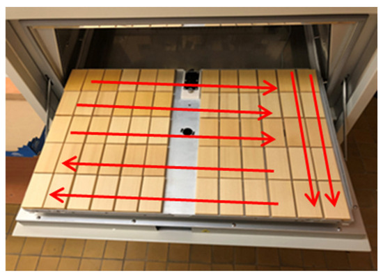The prepared specimens and the coated glass slides were exposed to accelerated ageing in a xenotest instrument (Q-SUN Xe-3-HS, Q Lab Europe, Ltd., Bolton, UK). The ageing conditions in the xenotest instrument were adjusted according to the Standard ASTM G155 [34]. This standard describes simulation of natural conditions in accelerated ageing of non-metallic materials, working with xenon lamps. In our case, we used the outdoor, so-called “dry”, regimen. This means that all the specimens were exposed to radiation only (Table 2). In accordance with ASTM G155 [34], the radiation intensity was set to a value of 0.35 Wm−2 at an irradiation wavelength of 340 nm. This corresponds to the mean annual radiation intensity in the temperate zone. The temperature value controlled on a black panel was 63 °C, the value of air temperature proposed to accelerate the changes on the wood surface was 48 °C (Table 2). This table shows that the duration of one accelerated ageing cycle was 120 min, and that the cycle consisted of two steps. The ageing process lasted 700 h, representing altogether 350 cycles. The specimens in the xenotest chamber were regularly and systematically shifted according to the layout (Figure 2) to guarantee uniform radiation intensity.