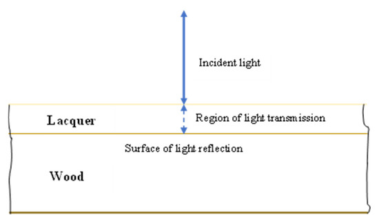 The colour of the substrate on which a transparent surface treatment is applied is difficult to measure directly. Thus, for measuring this variable there was proposed a model for determining the colour of the substrate (wood) surface-treated with transparent coating material. The idea backing up the model way the following: The light reaching the surface of wood surface treated with transparent CS penetrates the lacquer layers down to the wood surface (Figure 4).